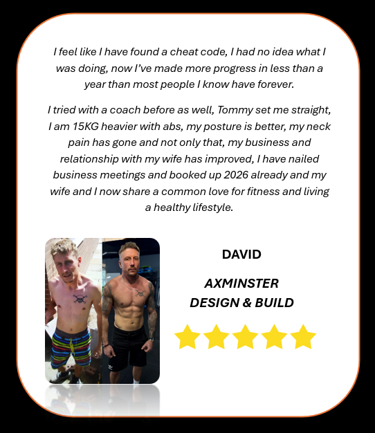 " I approached Tommy wanting to add muscle to my frame, always wanted to be bigger and more muscular but i just wasnt sure how, i couldnt seem to get the hang of it no matter what i tried or how much effort i put in. Tommy firstly put me on a fat loss diet which confused me at first because i wanted to grow muscle not get smaller but once he had explained why being lean first before trying to grow was so important I listened. Once the process had began to unfold the vision became clear. Over the course of a few months i worked hard following the plan closely and the results were getting better every single check-in, i became extremely lean by the end of it and im now into a new phase to start growing muscle, I look and feel totally different. I have acheived more in 3 months than i had in years before doing this.